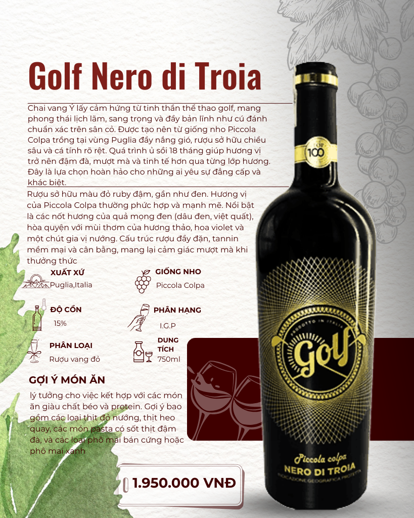 RƯỢU VANG Ý GOLF NERO DI TROIA: KIỆT TÁC HƯƠNG VỊ Ý VỚI MỨC GIÁ VÔ CÙNG HẤP DẪN